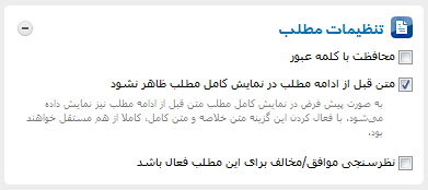 در این حالت که این گزینه فعال شده متنی که پیش از ادامه مطلب یعنی در صفحه اصلی مطلب منتشر شده در "ادامه مطلب" یا "نمایش کامل مطلب" نمایش داده نمیشود. یعنی هر متن به دو بخش مجزای قبل و بعد از "ادامه مطلب" تقسیم می شود که هر یک در دو صفحه جداگانه به نمایش درمی آیند. اما در حالتیکه این گزینه غیر فعال باشد مطلب شما بصورت یکپارچه در صفحه نمایش مطلب قابل مشاهده است.